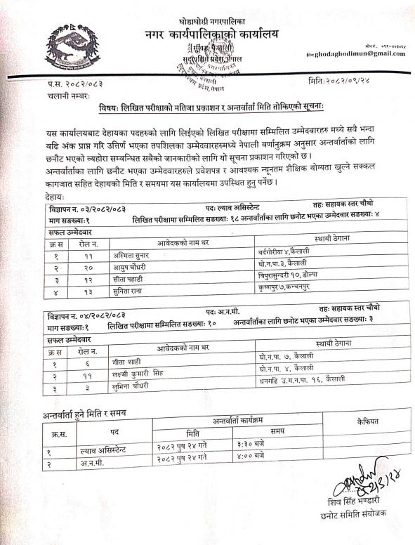 लिखित परिक्षाको नतिजा प्रकाशन र अन्तरबार्ता मिति तोकिएको सूचना ।