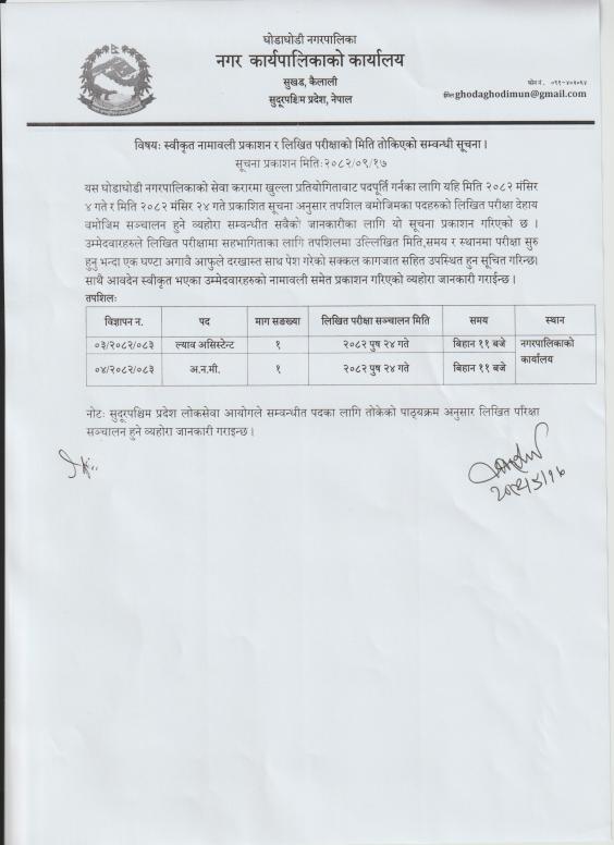 » स्विकृत नामावली प्रकाशन र लिखित परिक्षाको मिति तोकिएको सम्बन्धी सूचना ।
