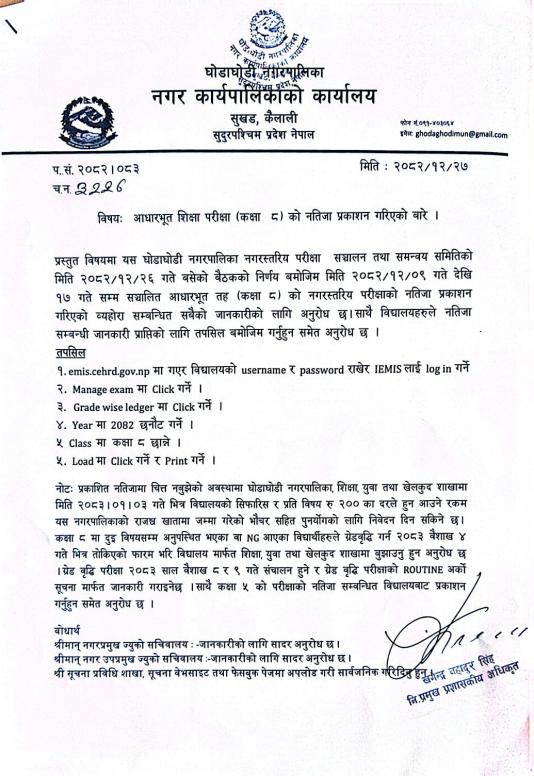 आधारभूत शिक्षा परीक्षा (कक्षा ८) को नतिजा प्रकाशन गरिएको बारे ।