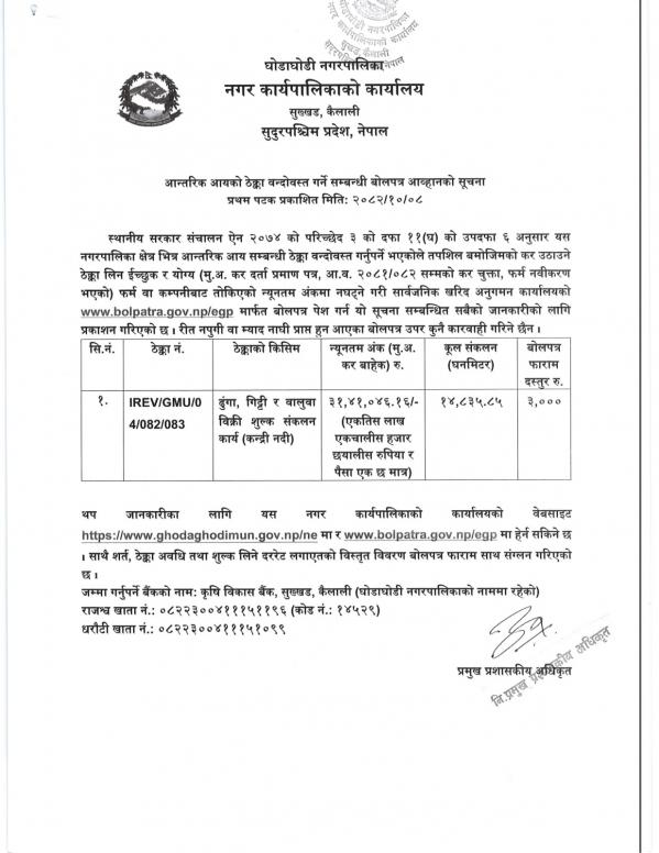 आन्तरिक आयको ठेक्का बन्दोबस्त गर्ने सम्बन्धी बोलपत्र आह्वानको सूचना । ठेक्का नंं. IREV/GMU/01/082/083