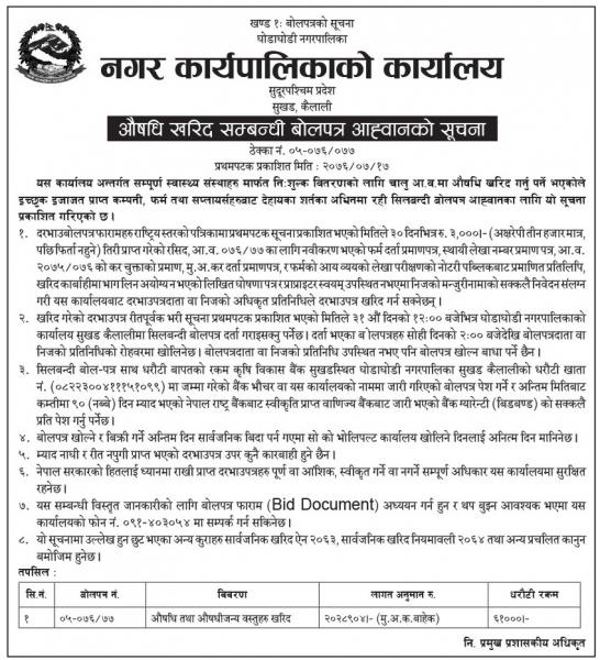 » औषधि खरिद सम्बन्धी बाेलपत्र आह्वानकाे सूचना