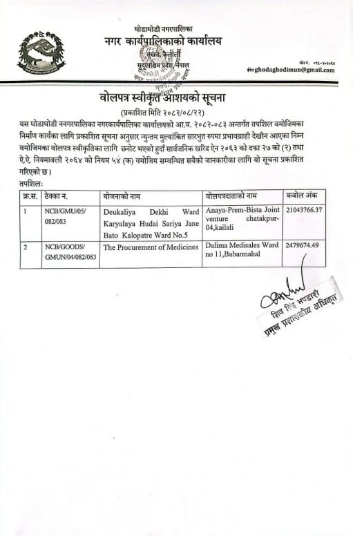 बोलपत्र स्वीकृत आशयको सूचना ।