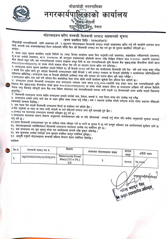 मोटरसाइकल खरिद सम्बन्धि शिलबन्दी दरभाउ आह्वानको सूचना ।
