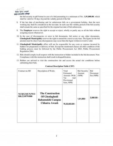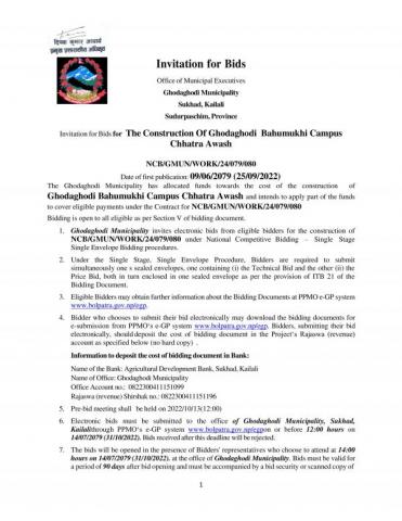 Invitation for Bids for The Construction Of Ghodaghodi Bahumukhi Campus Chhatra Awash